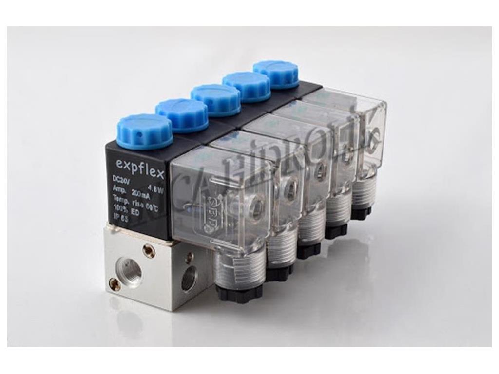 elektropilot valf 1 giriş 1 çıkış olmak üzere 4'l 5'li grup olarak 3/2 normalde açık 3 v serisidir tahliye yeri bobin üstünden atılır